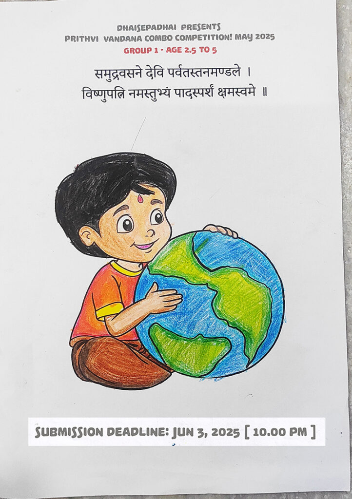 We are excited to announce this month’s creative competition that beautifully blends art and devotion! Children are invited to participate in two joyful activities — Painting and Shloka Recitation, both inspired by the sacred verse “Samudra Vasane Devi”, a prayer that honors Mother Earth and seeks her blessings before stepping on the ground each morning. This is a wonderful opportunity for children to explore Indian culture and express their gratitude toward nature through creativity and voice.