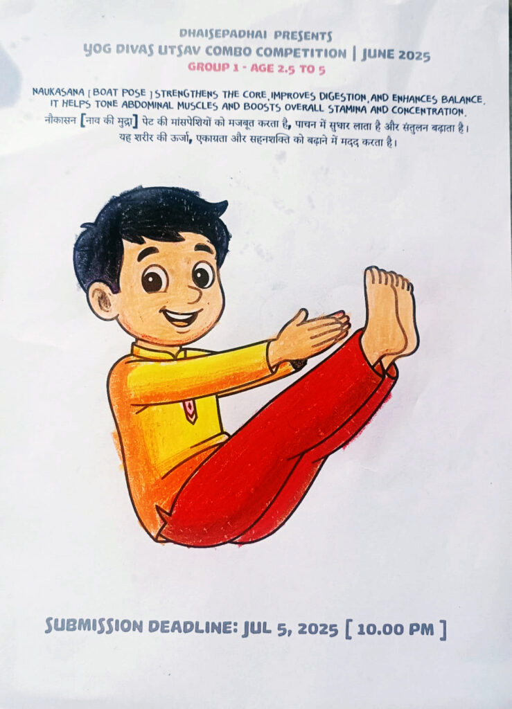 ग्रुप १(आयु २. ५ to ५ ): दिए गए नौकासन (नाव की मुद्रा) चित्र का प्रिंटआउट निकालें, उसे रंग भरें और बच्चे का वही योग मुद्रा करते हुए छोटा वीडियो भेजें।[५ से ७ सेकंड तक इसी मुद्रा में रहें]