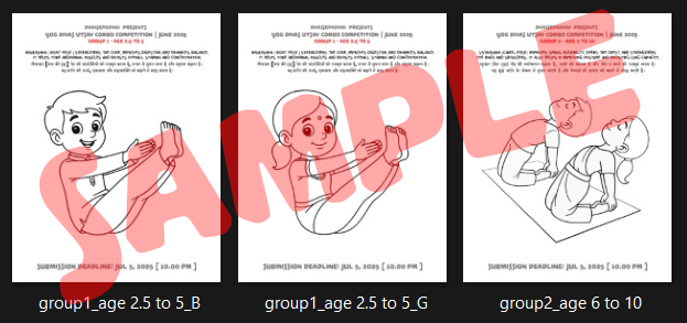 ग्रुप ३(आयु ११ to १८): विषय – अंतर्राष्ट्रीय योग दिवस। इस पर एक रचनात्मक चित्र बनाएं और बच्चे का धनुरासन (धनुष मुद्रा) करते हुए छोटा वीडियो भेजें।[५ से ७ सेकंड तक इसी मुद्रा में रहें]